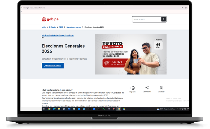 Los peruanos residentes en el exterior podrán acceder de manera clara, ordenada y confiable a toda la información relacionada con las Elecciones Generales 2026 a través de la plataforma digital “Tu voto cruza fronteras”, un espacio informativo alojado en el portal oficial de la Cancillería y al que se puede acceder directamente a través de www.gob.pe/tuvotocruzafronteras.